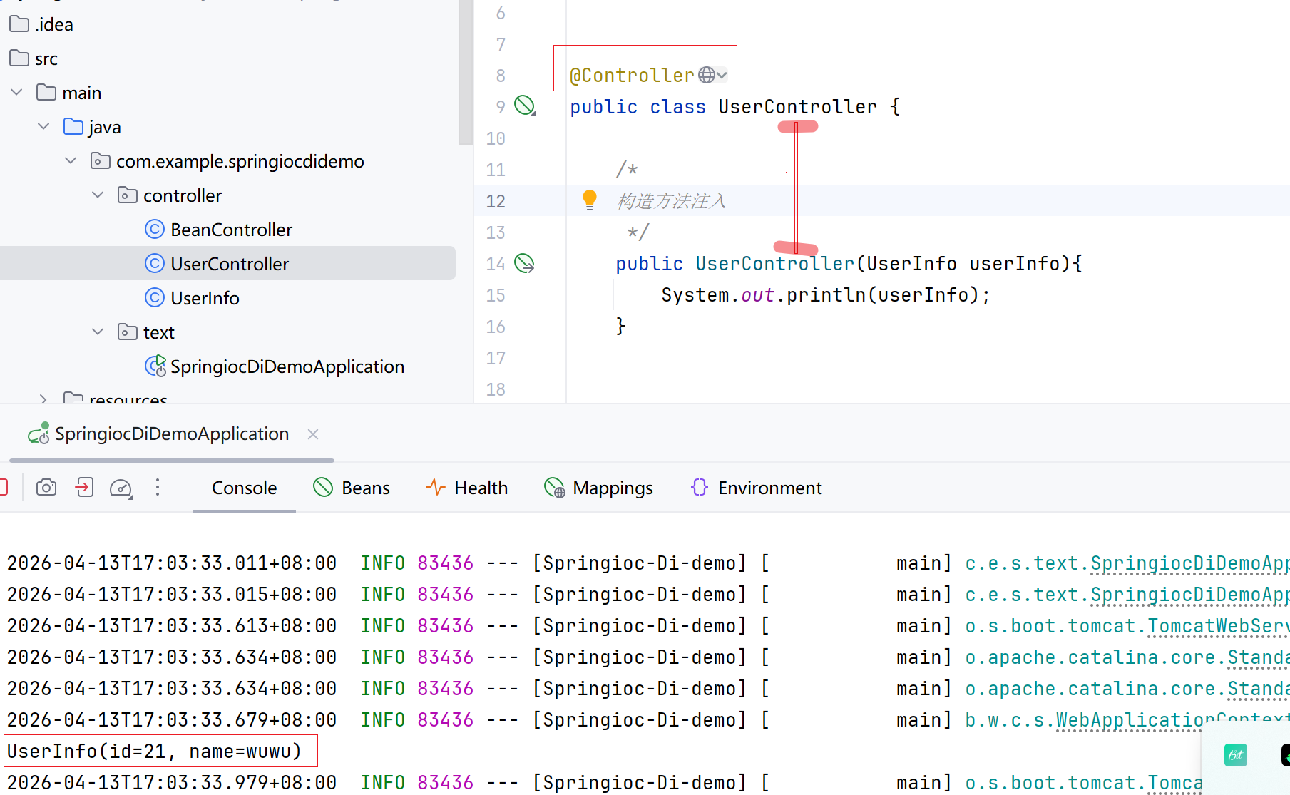 我们spring创建对象后丢进容器中这一步里,创建对象,是不是要调用构造方法,就像我们上面写的,spring把已经创建好的对象UserInfo注入到了UserController对象的构造方法里了,需要注意的是,UserInfo要交给Spring管理,才能注入给UserController的构造方法,且UserController对象也要加上五大注解,交给Spring管理,才会给你构造方法注入。
