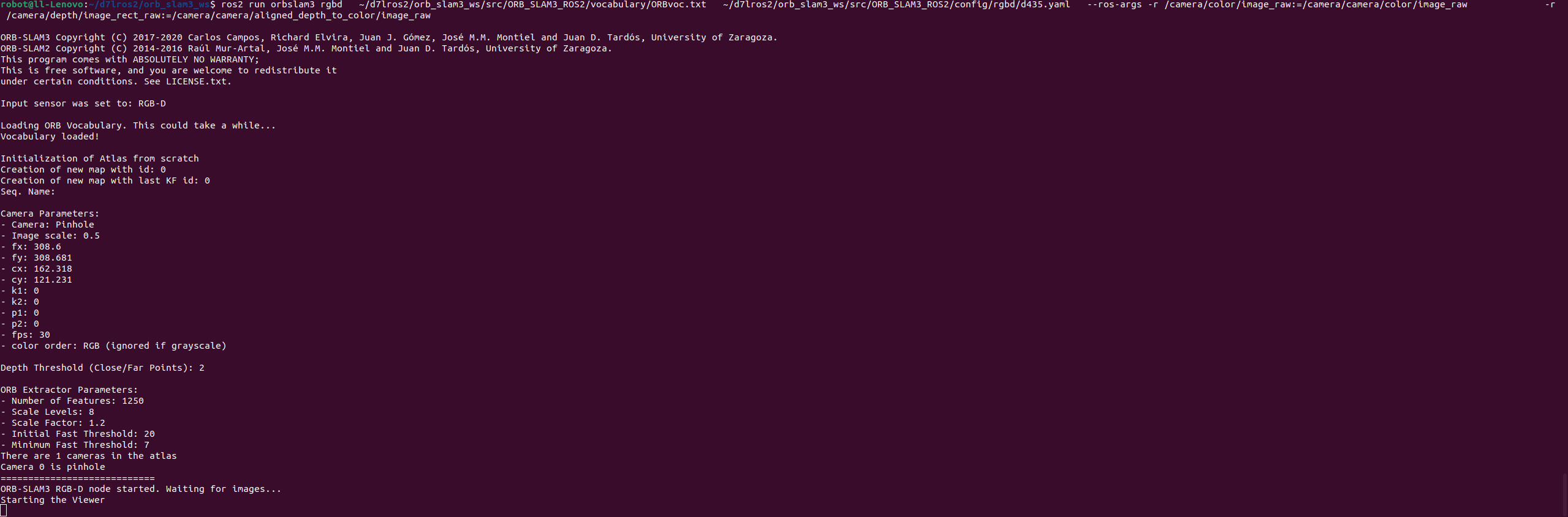 robot@ll-Lenovo:~/d7lros2/orb_slam3_ws$ ros2 run orbslam3 rgbd ~/d7lros2/orb_slam3_ws/src/ORB_SLAM3_ROS2/vocabulary/ORBvoc.txt ~/d7lros2/orb_slam3_ws/src/ORB_SLAM3_ROS2/config/rgbd/d435.yaml --ros-args -r /camera/color/image_raw:=/camera/camera/color/image_raw -r /camera/depth/image_rect_raw:=/camera/camera/aligned_depth_to_color/image_raw