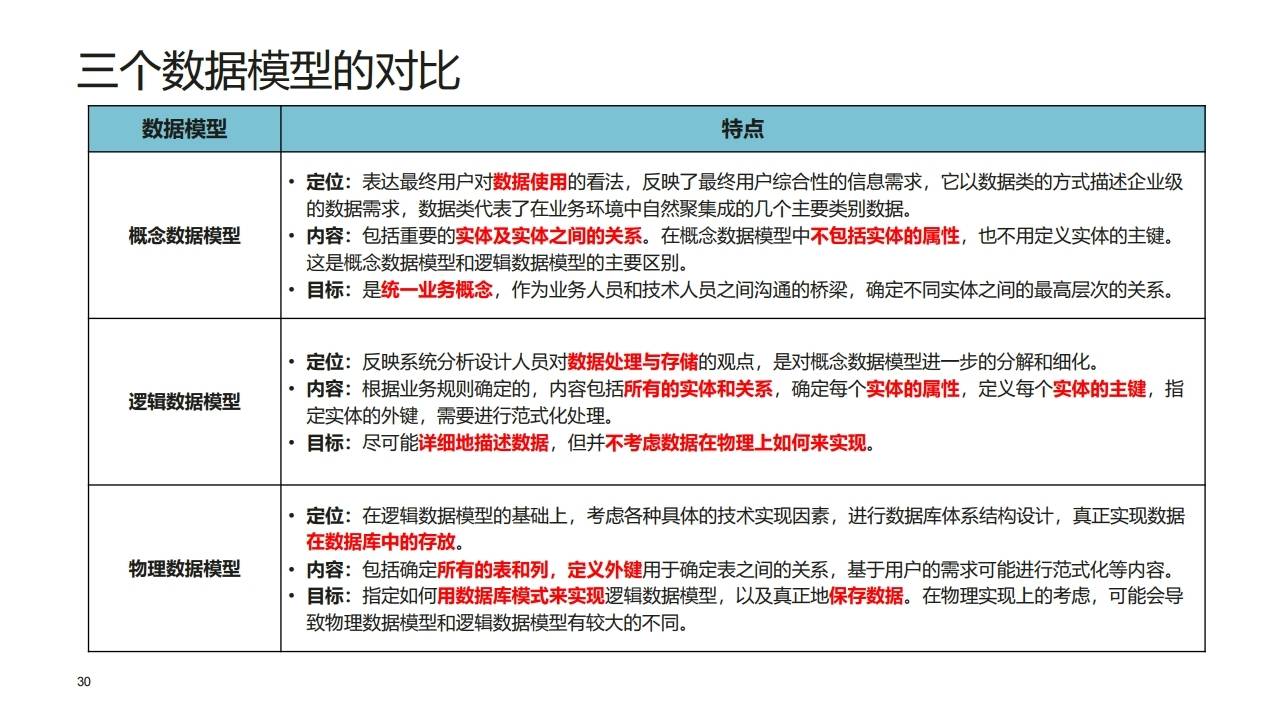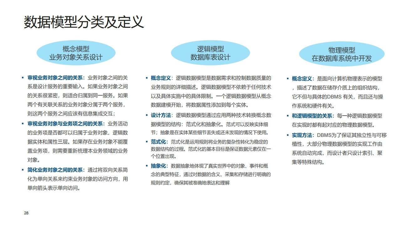 | L4 | 逻辑数据实体 | 具有一定逻辑关系的属性组合(如客户基本信息、订单明细)。 | 支持快速检索,是数据库表设计的前身。 |