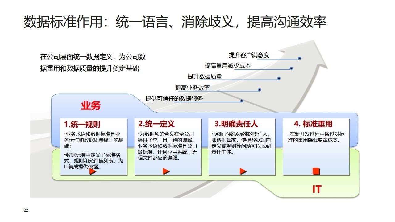 - 职责: 每个数据标准都必须指定唯一的责任主体(数据管家),负责该数据的定义、规则制定和质量监控。