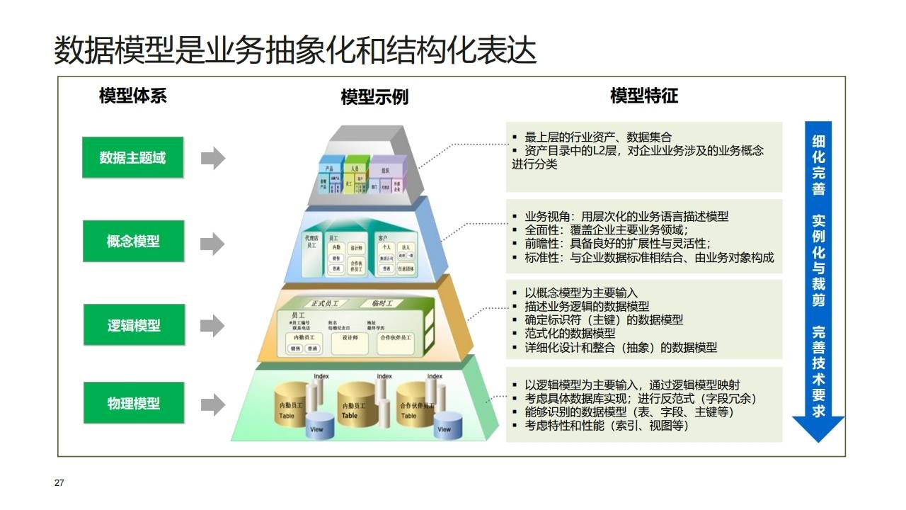 - 承上: 整合抽象业务对象、逻辑数据实体和属性,将业务的语言转化为IT能理解的语言。
