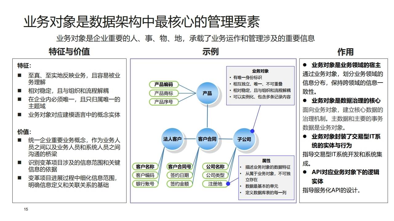 | L3 | 业务对象 | 核心要素。企业重要的人、事、物、地(如客户、产品、合同)。 | 统一业务概念,是业务与IT沟通的桥梁;需识别Owner。 |