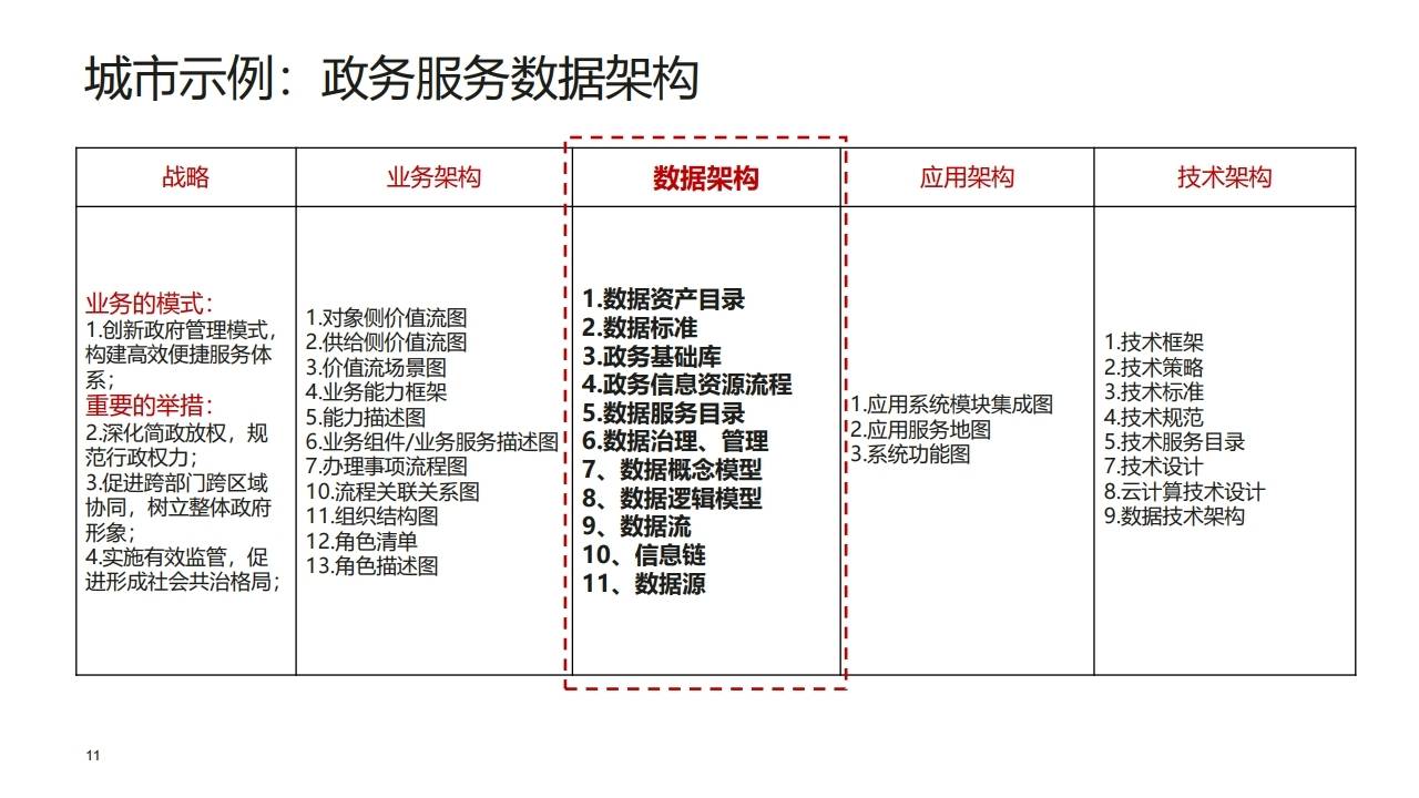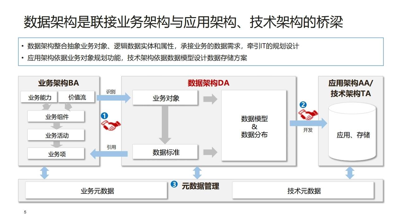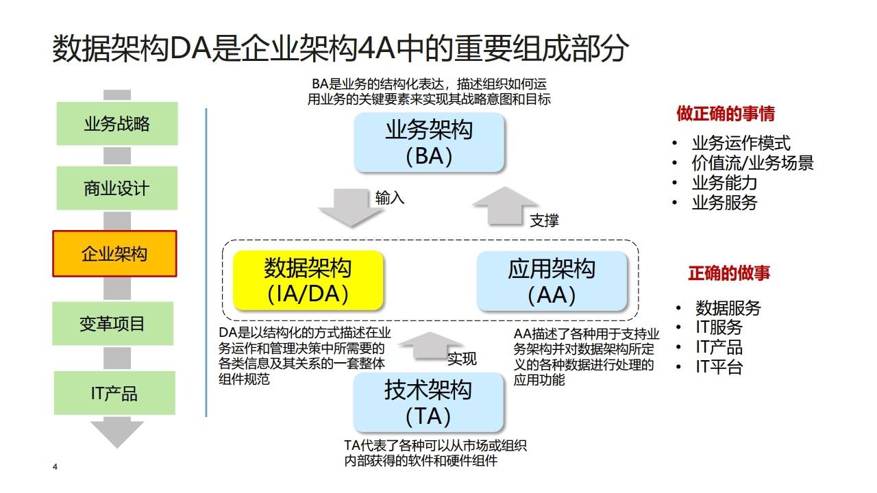 - 数据架构(DA): 回答"正确的做事"。它以结构化的方式描述业务运作和管理决策所需的数据及其关系。它是承接业务需求、牵引IT规划的关键。