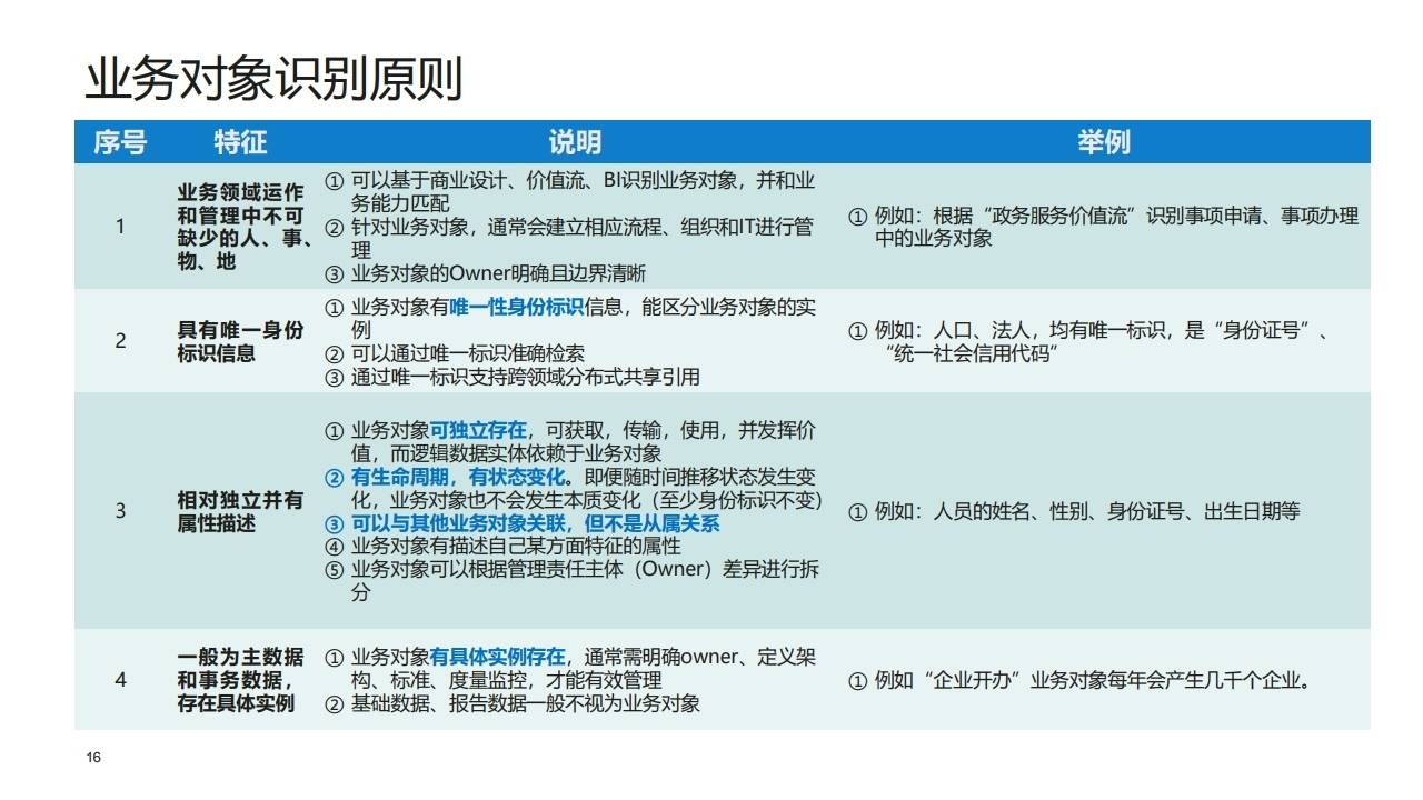 - 唯一标识: 必须具有唯一性身份标识(如身份证号、统一社会信用代码),支持跨领域共享。