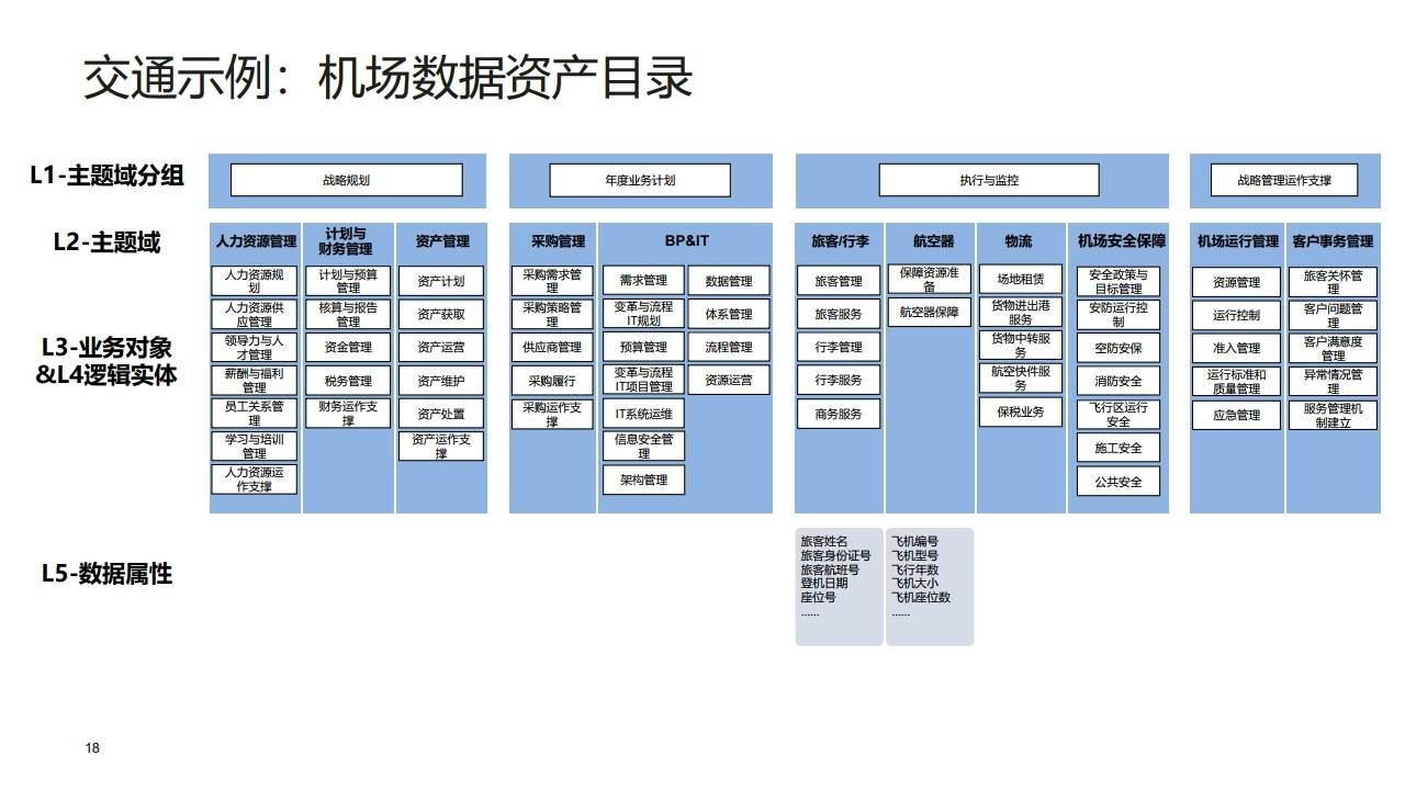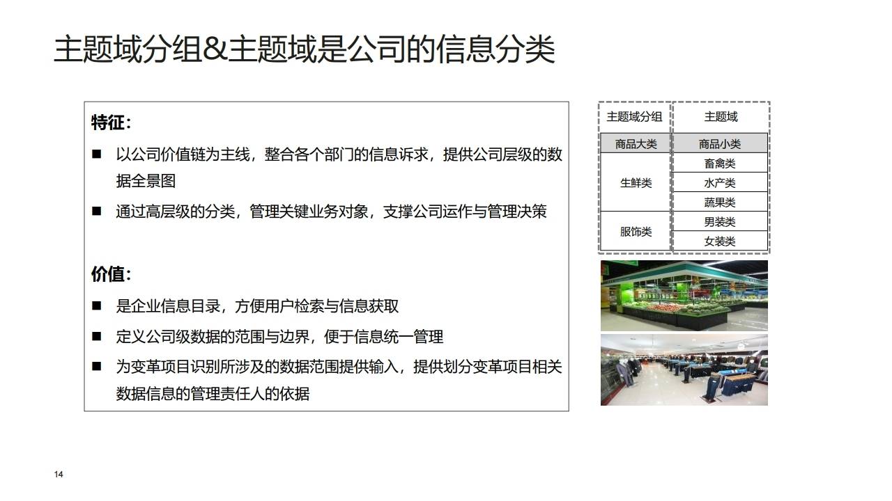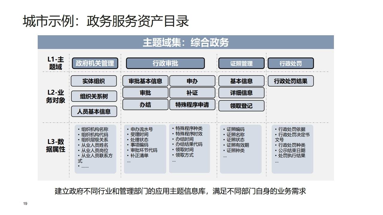 | L2 | 主题域 | 对L1的细化,代表特定的业务领域(如生鲜类、行政审批、人力资源管理)。 | 作为信息目录,方便用户检索与信息获取。 |