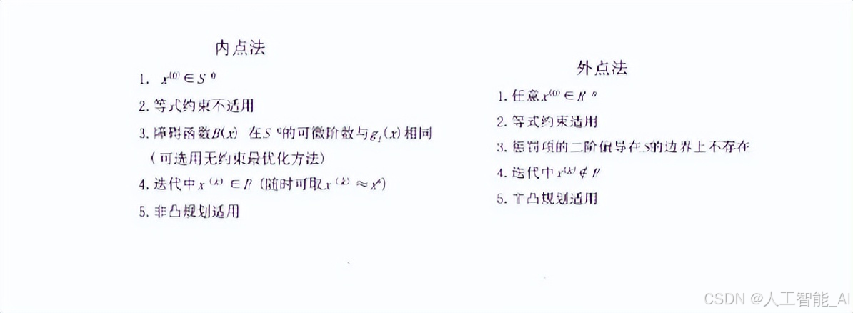 二者的区别如上所示,从的来说内点法中的点必须在可行域中,而内点法不能处理等式约束问题。
