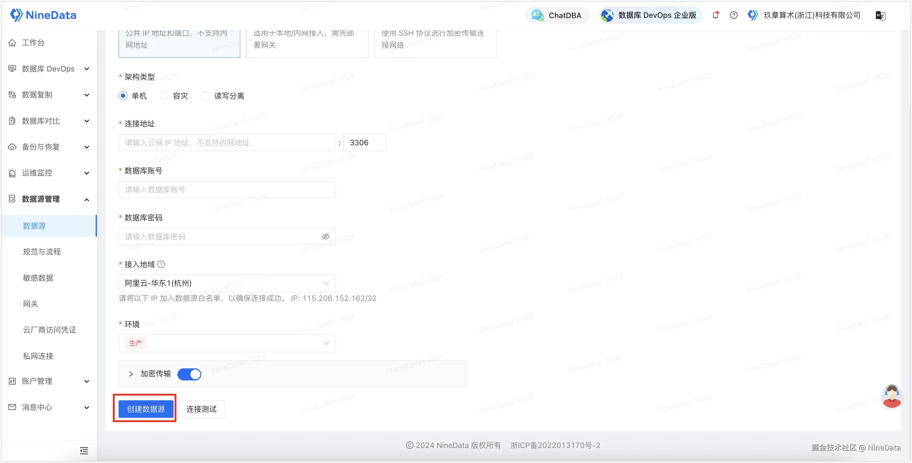 - 根据页面提示进行配置,然后单击创建数据源完成创建。