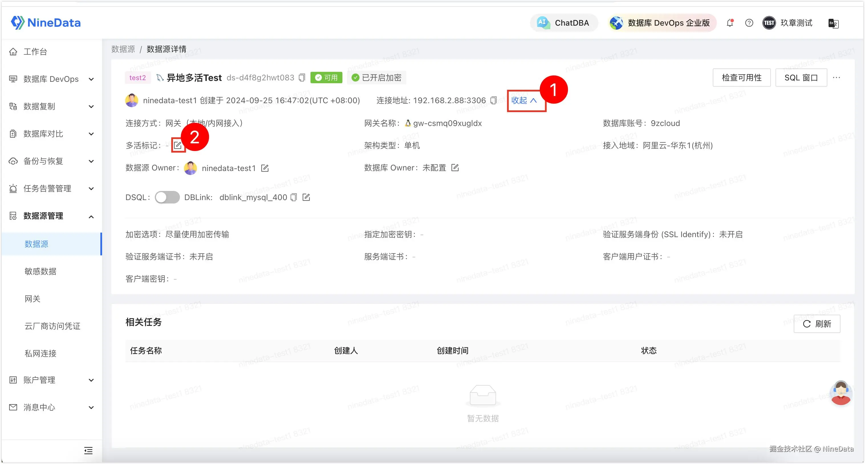 - 单击数据源 ID 进入数据源详情 页面,单击展开 ,找到多活标记,配置多活标记名称。该步骤所有参与复制的数据源都需要执行,以防止发生数据循环复制。