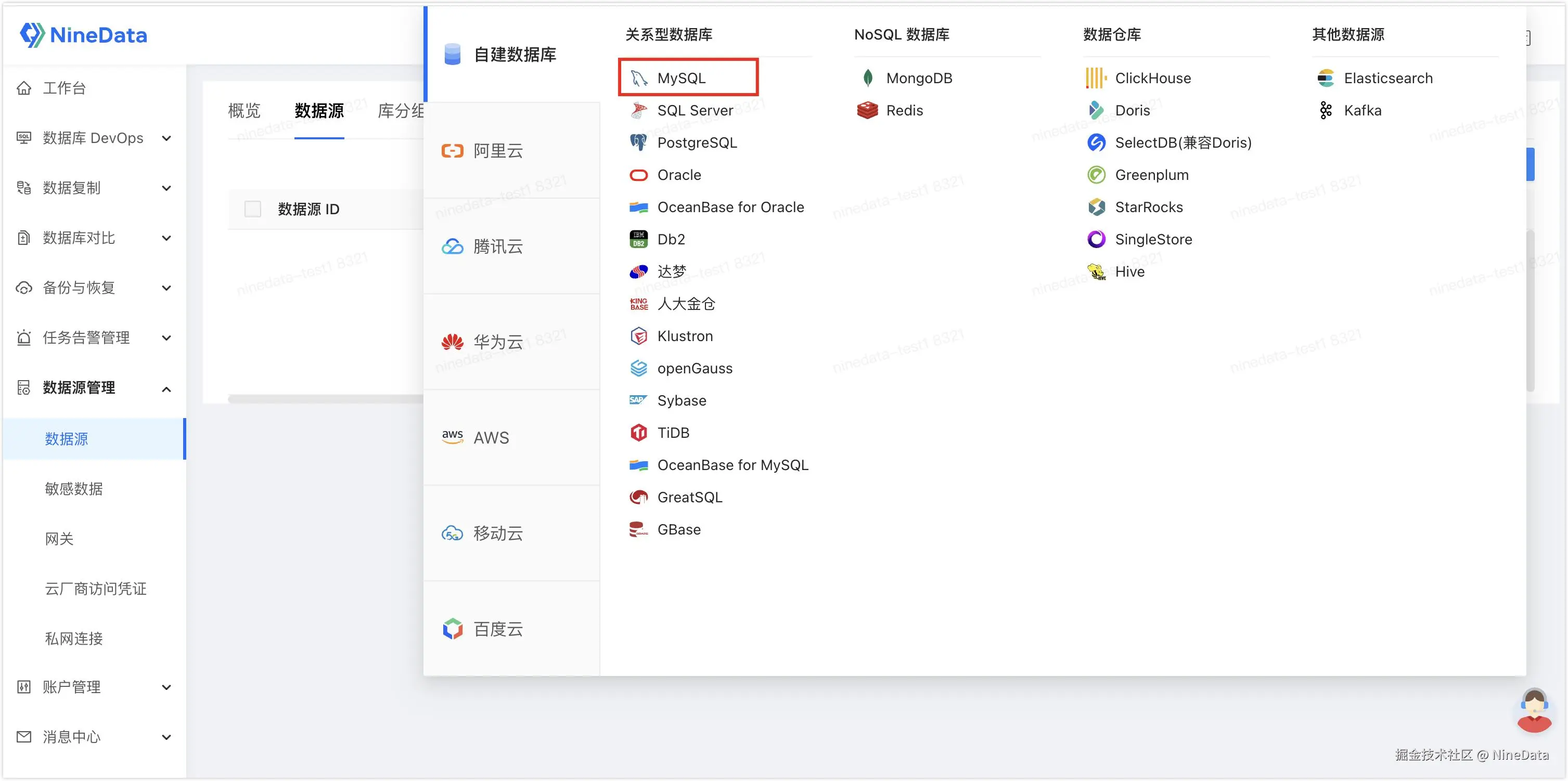 - 登录 NineData 控制台,单击数据源管理>数据源 ,然后在页面中单击创建数据源,选择需要录入的数据源。