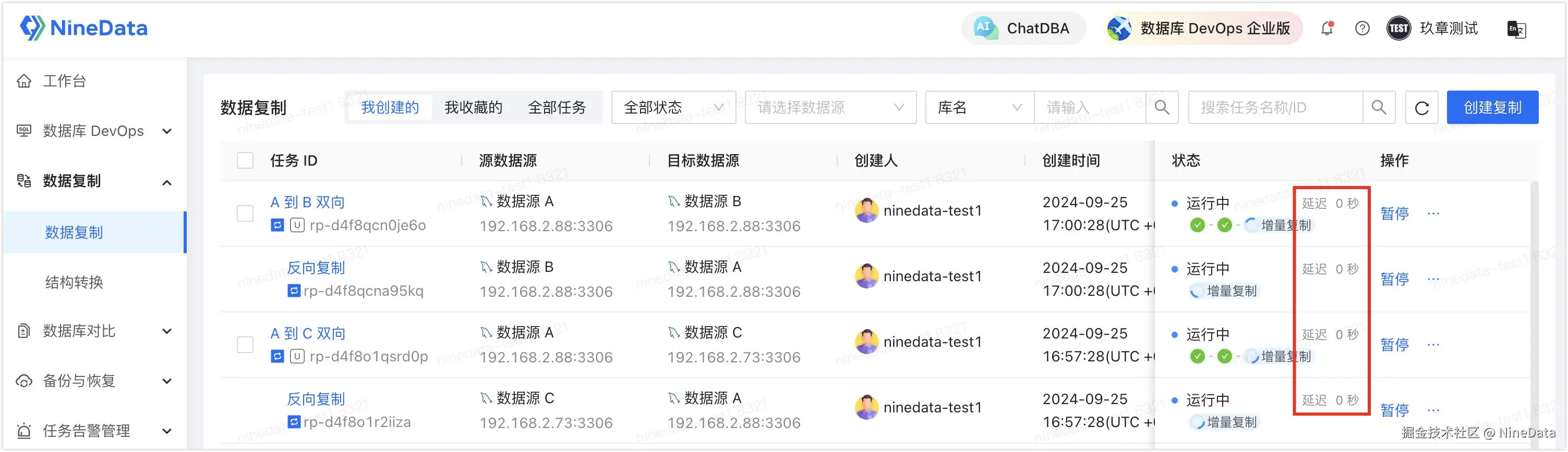 - 根据页面提示完成配置后,在数据复制的任务列表中可以看到多了 2 条双向复制任务,当正反向任务的延迟为 0 的时候,代表数据源 A、B、C 之间的数据是一致的。