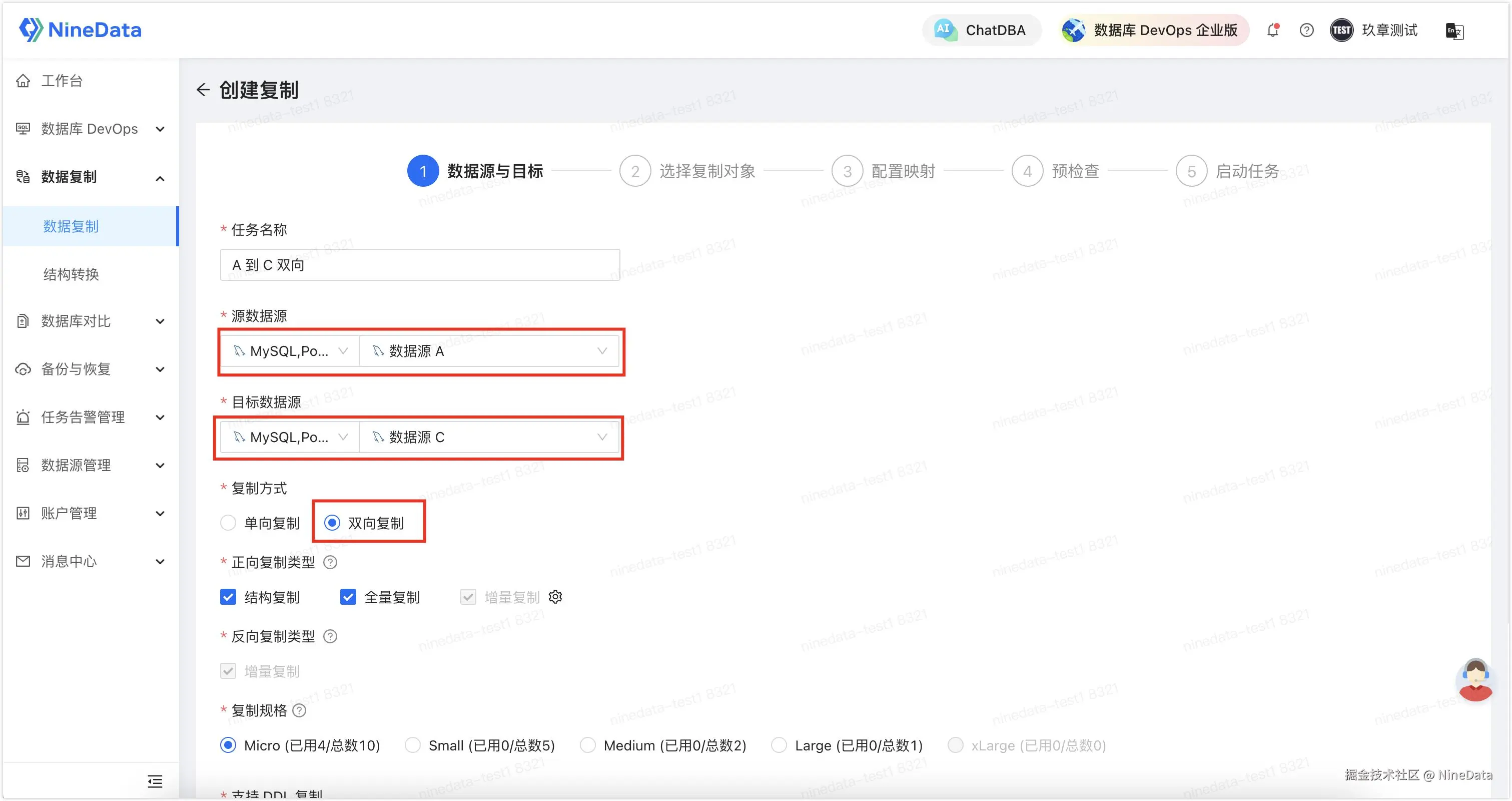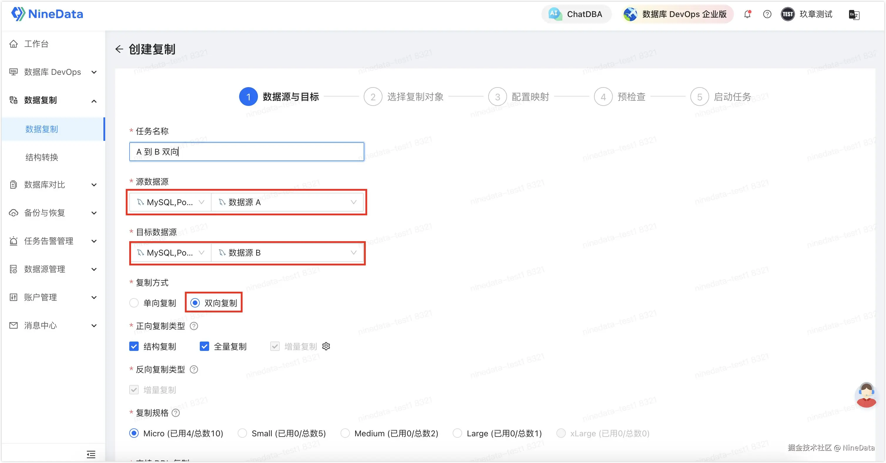 - 根据页面提示配置复制任务,源数据源 处选择数据源 A,目标数据源 处选择数据源 B,然后在复制方式 处选择双向复制。
