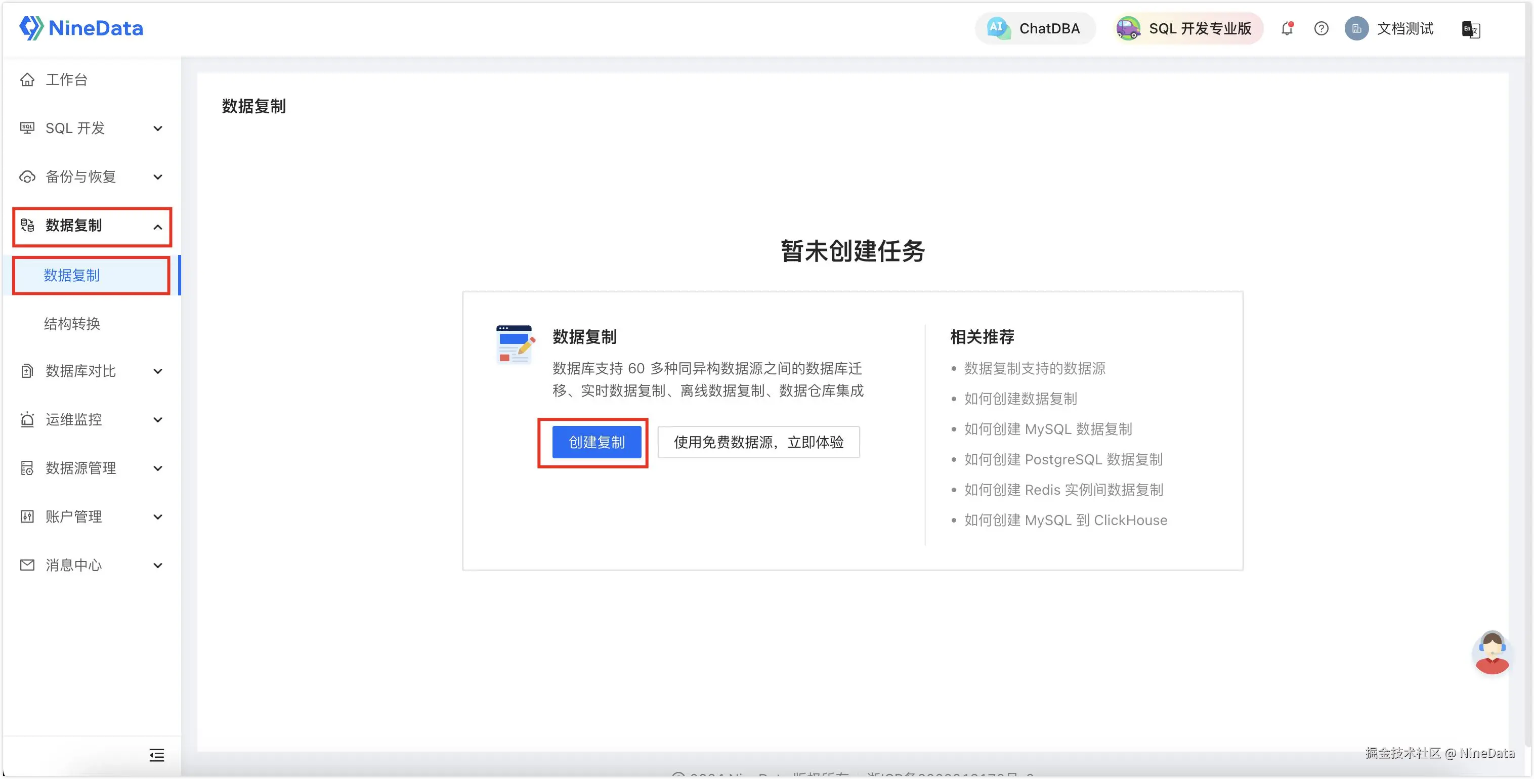 - 登录 NineData 控制台,单击数据复制>数据复制 ,然后单击创建复制。