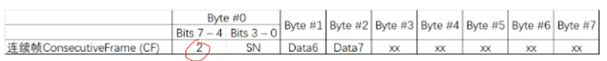 连续帧格式如图所示,连续帧第一个字节PCI的高四位为2,PCI的低四位为帧计数器,第二个字节byte1起为剩余传出的数据。例如首帧已经传输了Data0,Data1...至Data5,则第一个连续帧接着传输Data6,Data7...至Data12,第二个连续帧接着传输Data13,Data14...,以此类推直至所有数据传输结束。