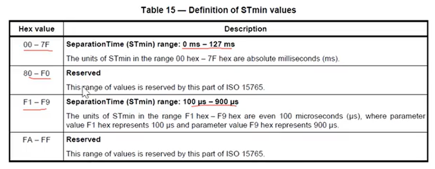 BS表示接收端允许发送端连续发送的最大连续N_PDU帧数,BS为0的时候告诉发送端可以发完剩余的全部N-PDU,BS为01-0xFF时,表示发送端可以发的连续帧最大帧数。STmin表示发送端发送连续帧的最小间隔时间