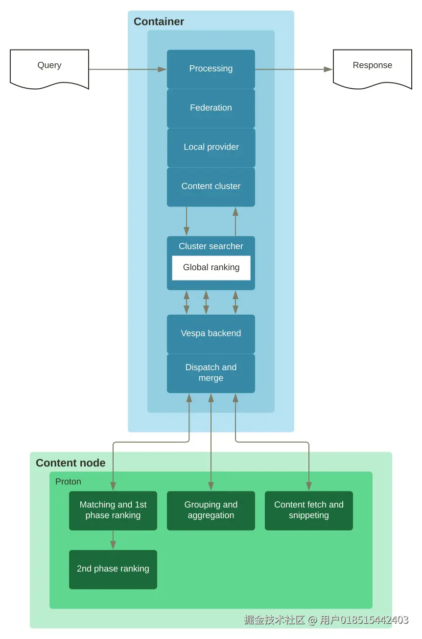 Vespa 官方提供了比较完整的 phased ranking 机制,支持 first-phase、second-phase 和 global-phase。官方文档说明,检索阶段可以使用 weakAnd、nearest neighbor 等高效算子先做候选选择;随后 second-phase 在 content node 上做更精细的重排;global-phase 则在合并结果后于 stateless container 上执行,适合做更昂贵但质量更高的最终 reranking。