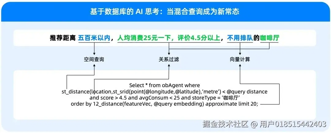 在上图的这个提问中: 距离五百米以内,是基于空间位置(GIS)的查询。 人均消费 25 元,评价 4.5 分以上,是基于传统标量的查询。 不用排队,是基于用户对店铺的评价,基于向量的语意检索。 mp.weixin.qq.com/s/raBPlHxsV...