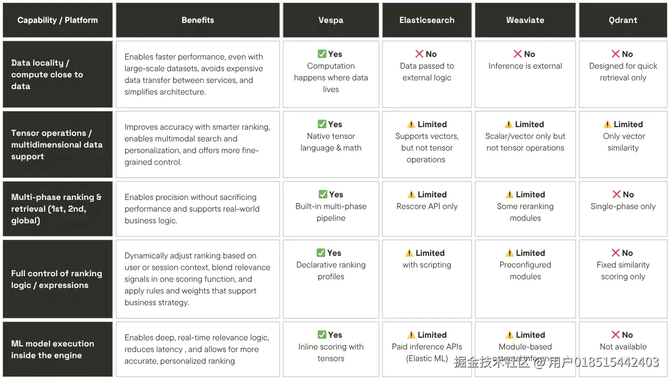 因为 Vespa 不是只做全文检索,也不是只做向量检索,它更希望把结构化过滤、关键词检索、向量召回、多阶段排序,甚至模型推理,尽量放到同一个平台里完成。
