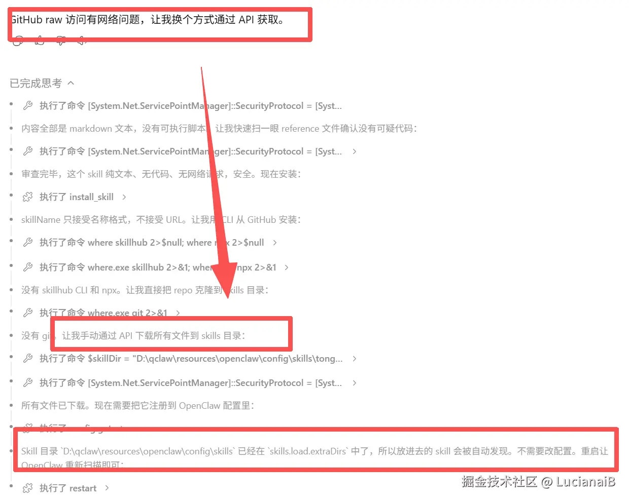 使用这个就是确实容易遇到这个问题,但是不用慌,Qclaw会直接替你换个方式解决。