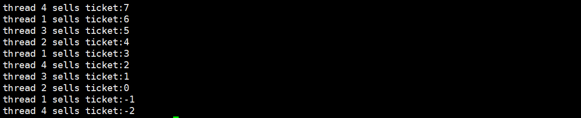 接下来 3 个线程依次执行 ticket--,相当于 1 张票被卖了 3 次,最终ticket从 1 → 0 → -1 → -2