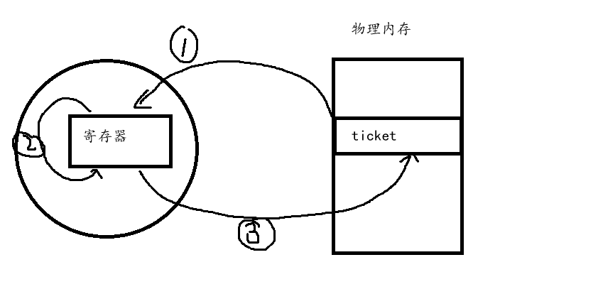 读:从物理内存把ticket的值,加载到当前线程的 CPU 寄存器(线程私有上下文)