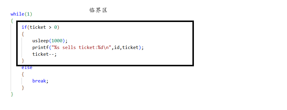 该代码中记录剩余票数的变量tickets就是临界资源,因为它被多个执行流同时访问,而判断tickets是否大于0、打印剩余票数以及--tickets这些代码就是临界区,因为这些代码对临界资源进行了访问。