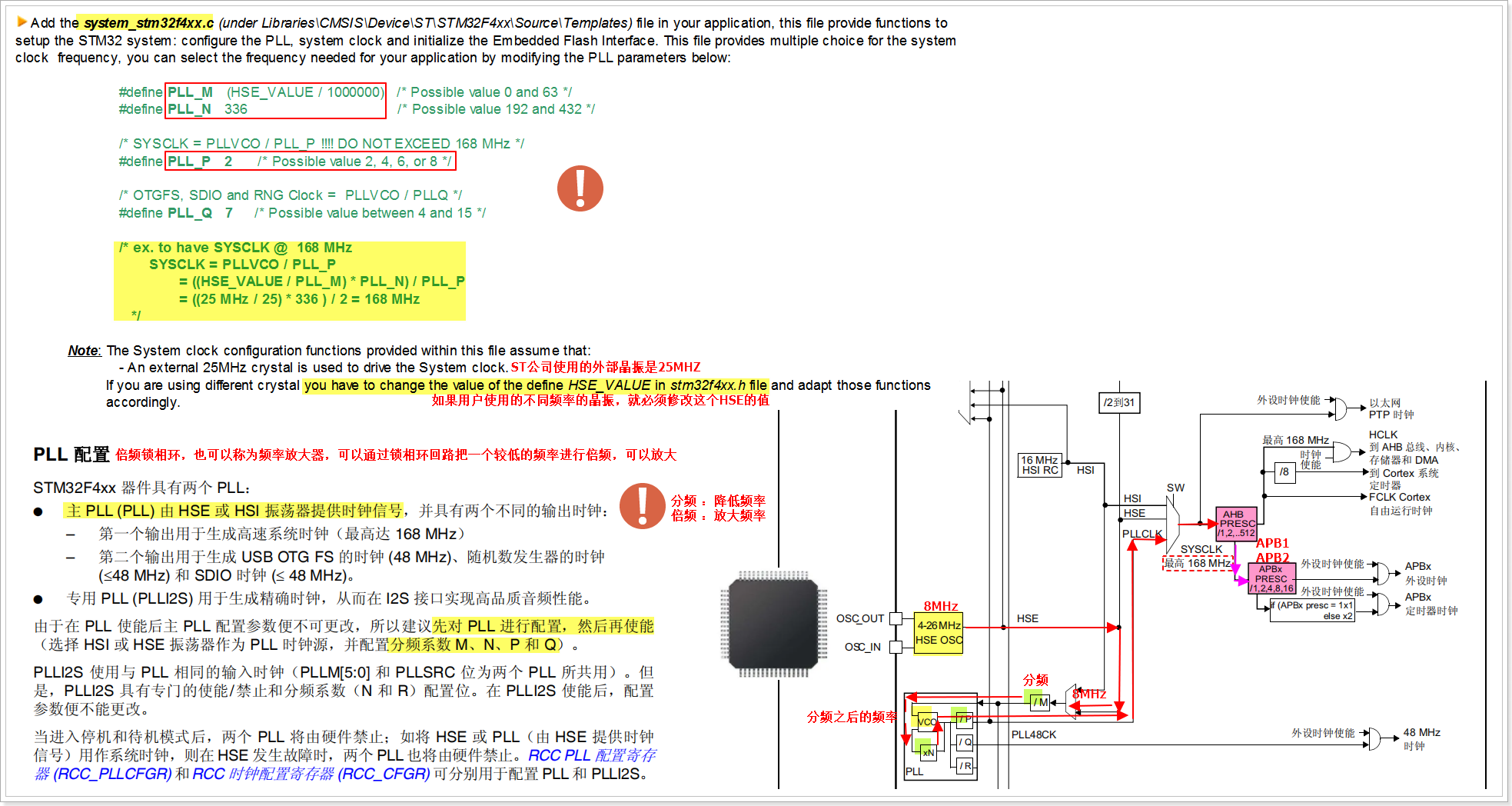 由于当前STM32F407芯片的PLL是HSE(8MHz)提供时钟信号(用于PLL可以把较低的HSE时钟频率进行放大),则需要用户修改工程中的PLL参数 以及修改工程中的HSE_VALUE和PLL_M。