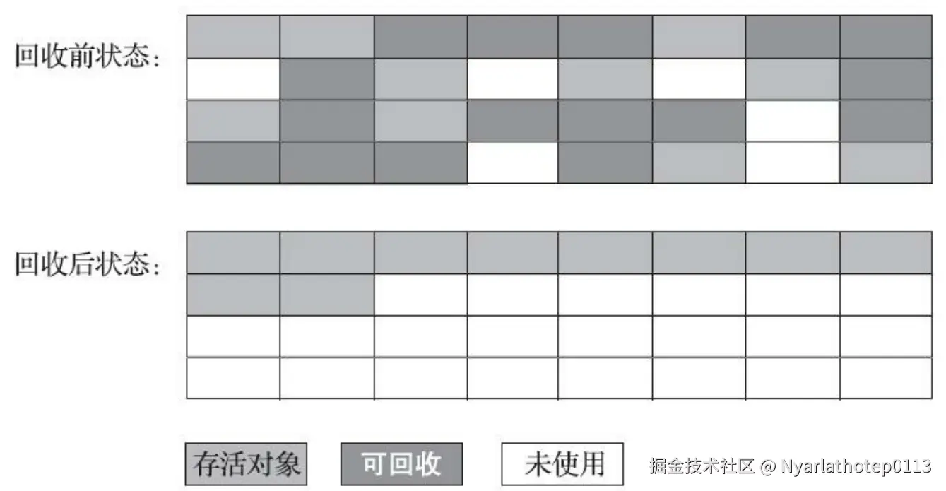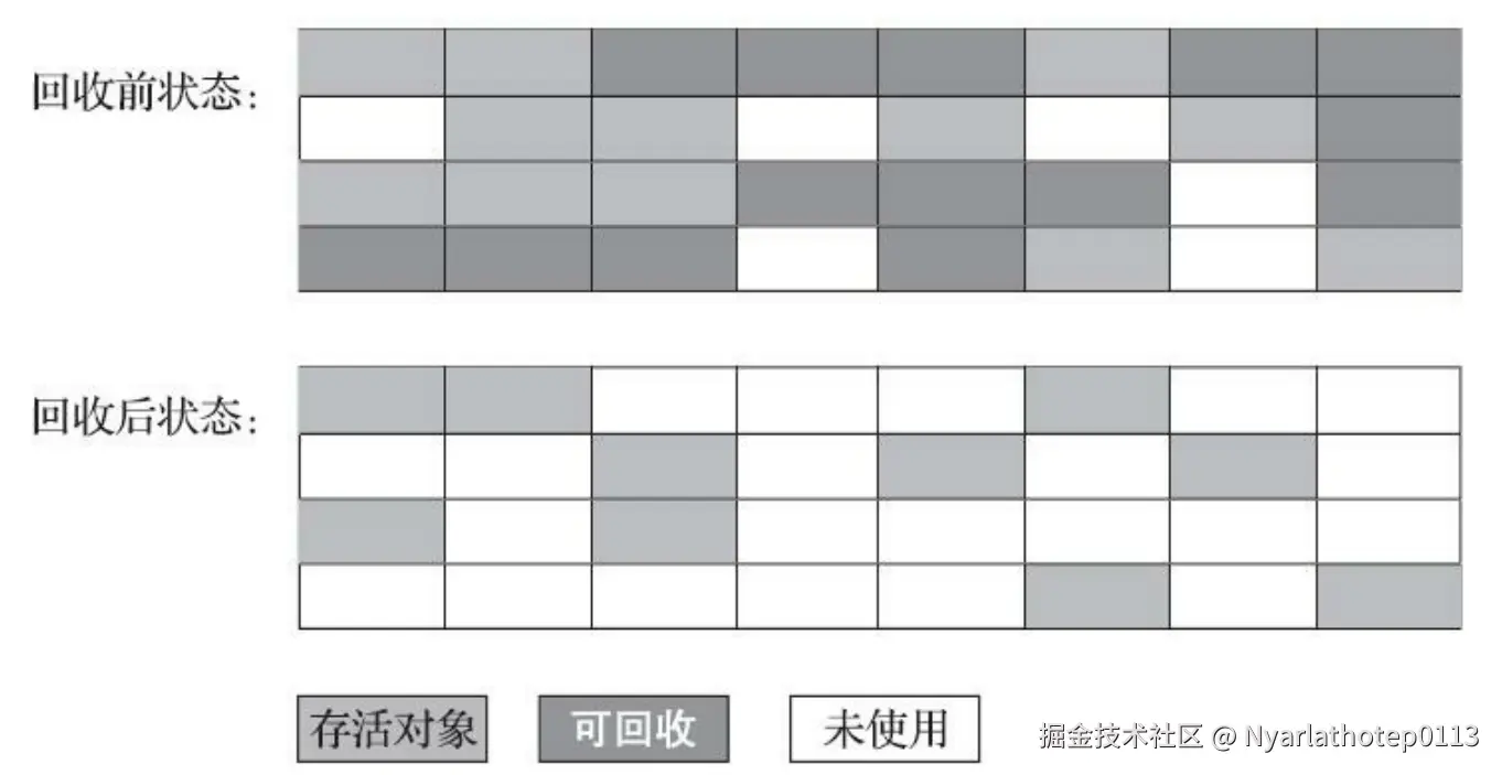 - 内存空间碎片化 ,标记清除之后会产生大量不连续的内存碎片 。后续分配大对象的时候,可能没有足够的连续空间,导致另一次