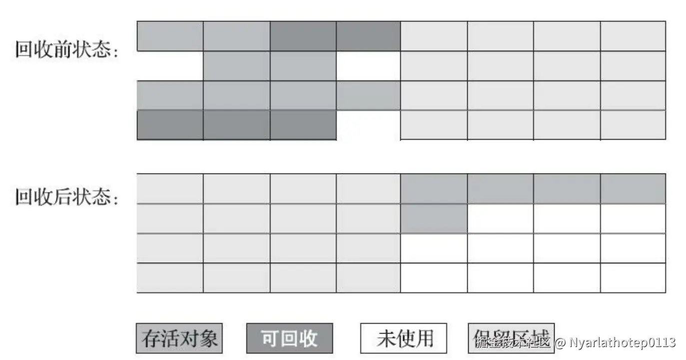 - 如果移动存活对象,尤其是老年代这种存活对象十分多的区域,移动对象并更新所有的引用是一种十分繁重的任务,并且需要全程暂停用户应用程序才能进行。