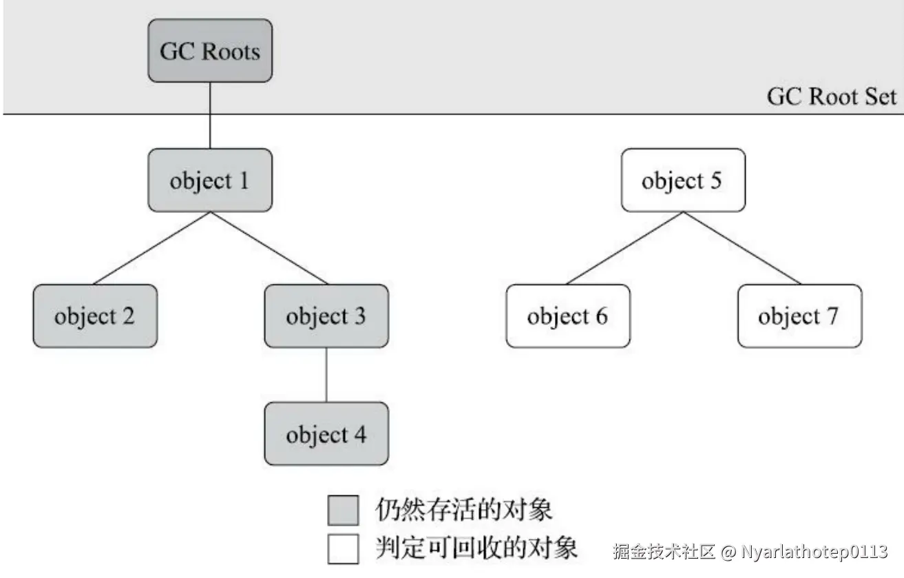 这个算法的基本思路 就是通过一系列称为GC Roots的根对象 作为起始节点集 ,从这些节点开始,根据引用关系向下搜索 ,搜索过程所走过的路径称为引用链 ,如果某个对象 到GC Roots间没有任何引用链相连 , 或者用图论 的话来说就是从GC Roots到这个对象不可达时,则证明此对象是不可能再被使用的。