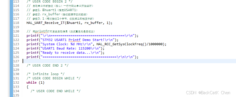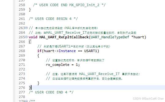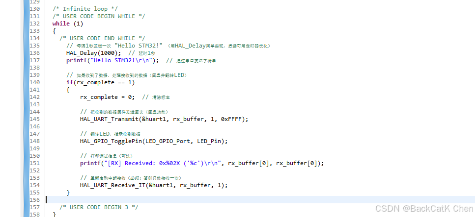 HAL_UART_RxCpltCallback:这是HAL库定义的串口接收完成回调函数,名字固定,不能改!当HAL_UART_Receive_IT设定的接收数量(本例是1字节)完成时,硬件自动触发中断,HAL库处理后调用这个回调函数。- 我们在回调里只做最简单的事:置标志位。不要在回调里做复杂处理(比如printf打印),否则可能导致中断嵌套或其他问题。把数据处理放到主循环里,这是良好的编程习惯。