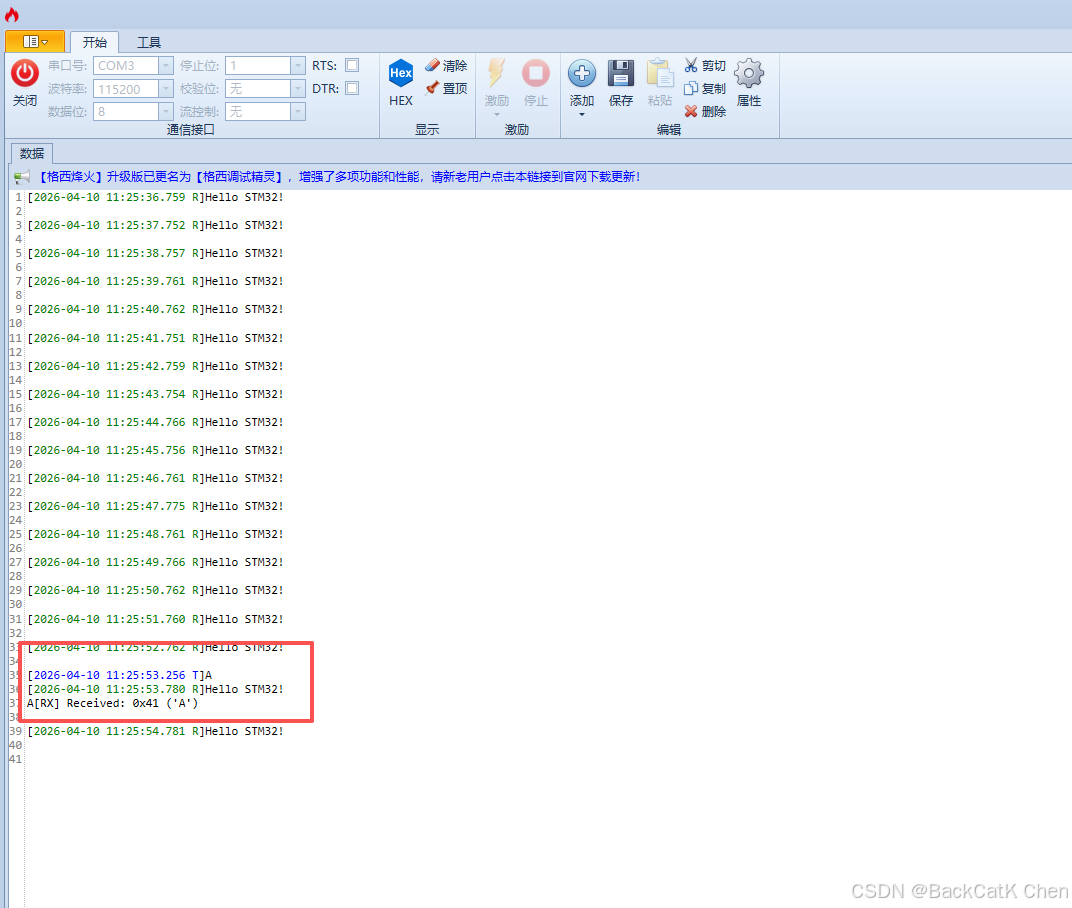 A),点击发送,会立刻在接收区看到收到的字符A,同时LED状态翻转,并且会打印类似[RX] Received: 0x41 ('A')的调试信息。