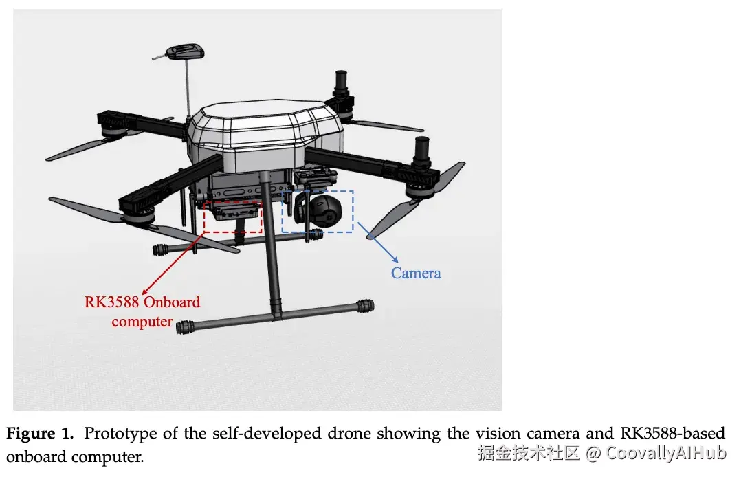 论文采用的硬件平台包括:自研四旋翼无人机、SIYI ZR10网络相机 (1920×1080分辨率,H.265编码,30fps)和基于RK3588 的自研机载计算机,软件栈基于ROS + OpenCV构建。整套系统的目标是在不依赖云端或地面站计算的前提下,完成从视频解码、目标检测到导航决策的全流程。