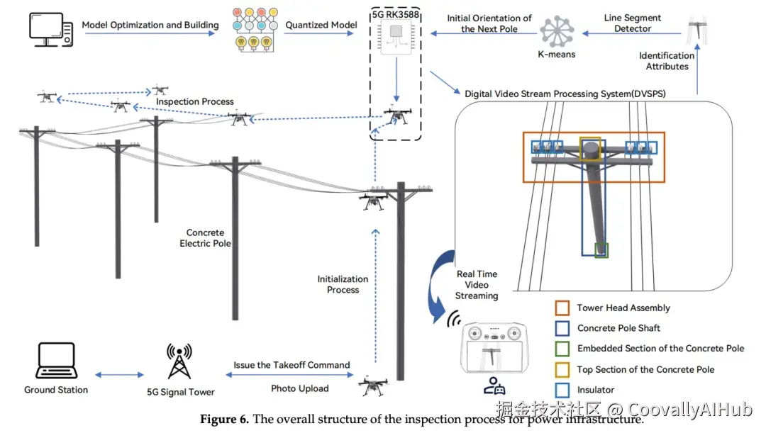 千叶大学Suzuki团队给出了一套从模型到系统的完整方案:对YOLOv8做 VanillaBlock重参数化+ Slim-Neck+ 结构化剪枝三步改造,剪枝后仅 3.7 GFLOPs、1.92M 参数;再通过自研的DVSPS异步视频处理系统(3核NPU并行 + 多线程调度 + 硬件加速编解码),RK3588三核NPU实测达到111.3 FPS,系统端到端延迟仅 23ms。最终在自建的11451张电力巡检数据集上部署验证,INT8量化后 mAP50达84.2%。更值得关注的是,系统还集成了无需外部航点的塔杆自主定位和导线追踪功能,将检测、导航、决策闭合在一块6 TOPS的板子上。