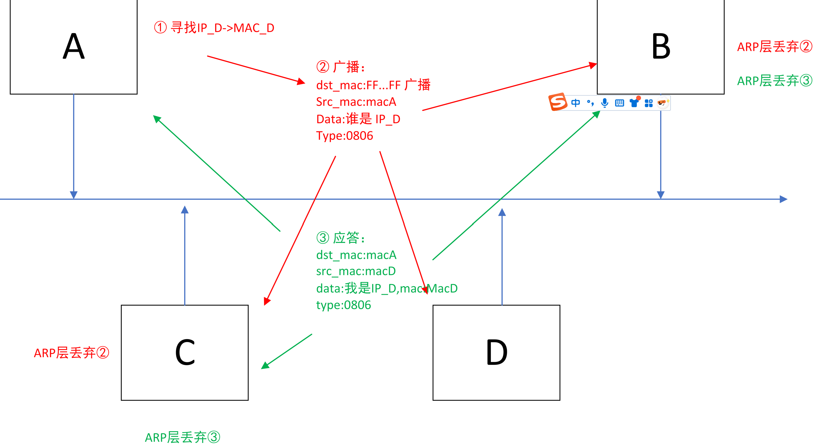 当主机A想知道主机D的Mac地址时,首先会先在以太网中进行广播,在源地址中带上自己的Mac地址,同时也会带上ARP协议的类型编号,数据部分会带上要寻找的Mac地址对应的IP地址,每个主机对应的ARP就会识别对应的内容,除了D主机之外,其它主机的ARP协议会将该报文丢弃,D主机进行应答,目的地址为MacA,源地址为MacD,类型为ARP协议的类型编号,并在数据部分带上自己的Mac地址,继续放到以太网中进行传播,如下图所示: