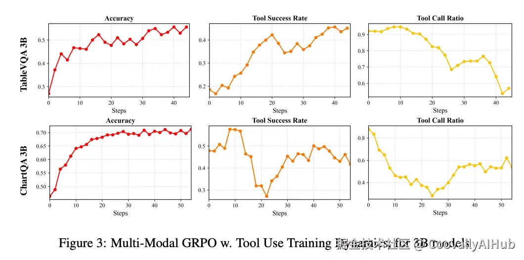 论文中最有意思的发现之一来自训练动态分析:工具调用频率不与准确率单调增长。