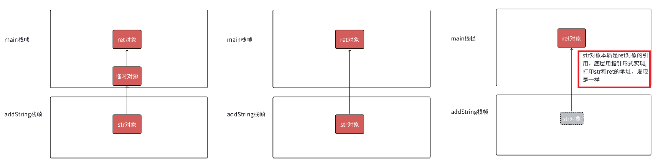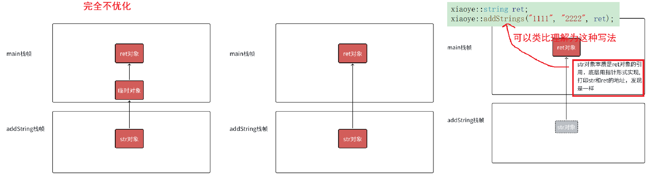 右边图展示为 vs2019 的 release 版本或者 vs2022 的 debug和release 版本,代码优化非常恐怖------会直接将str对象的构造,str拷贝构造临时对象,临时对象拷贝构造ret对象,合三为一,变为直接构造。要理解这个优化就要结合局部对象生命周期和栈帧的角度理解。