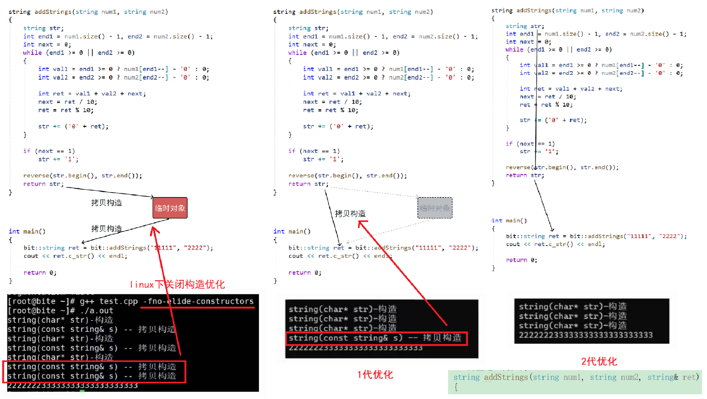 如下左边图 为 linux下可以将下面代码拷贝到test.cpp文件,编译时用 g++ test.cpp -fno-elide-constructors的方式关闭构造优化,运行结果可以看到左边没有优化的两次拷贝 ;