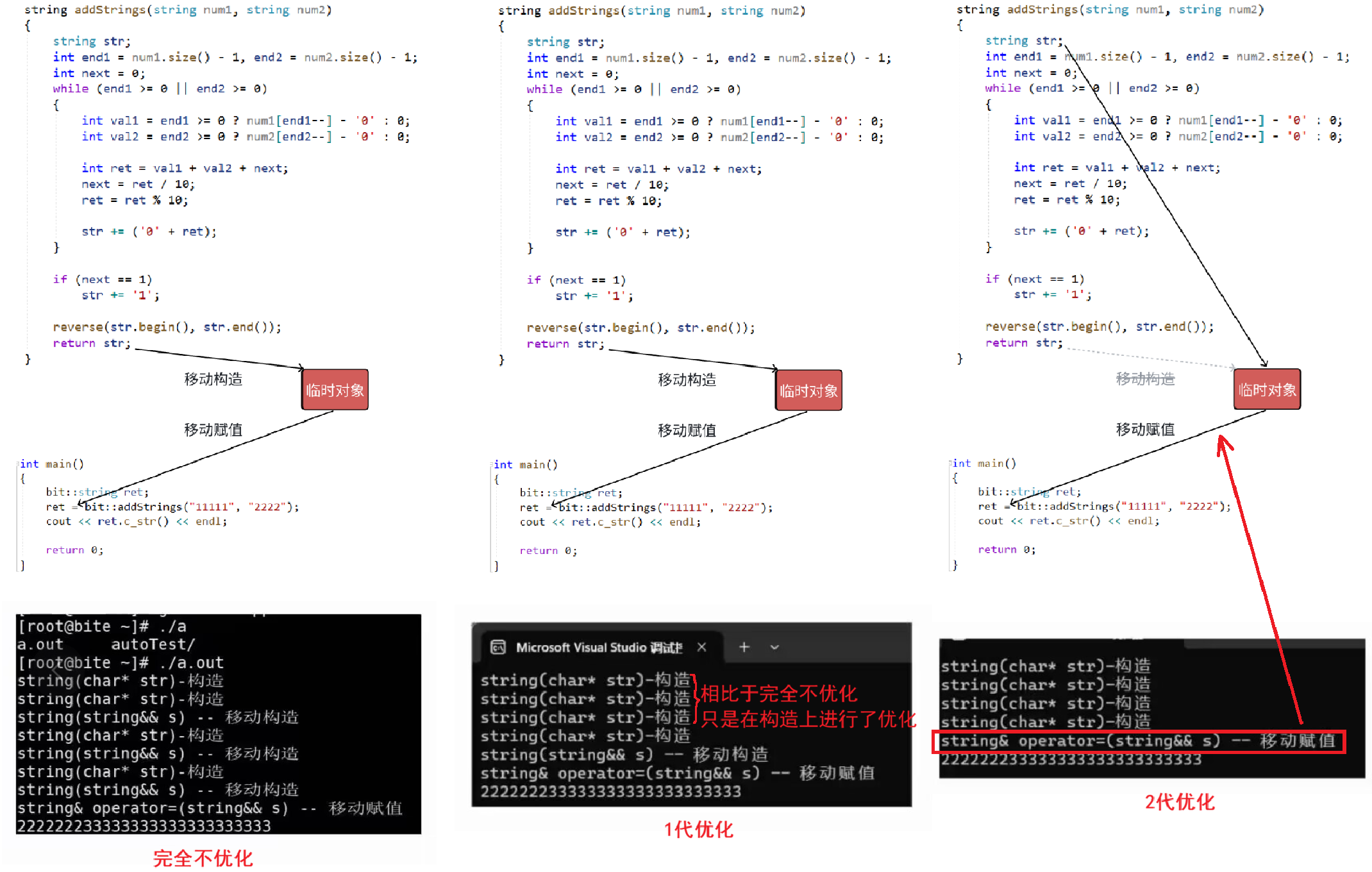 如下左边图 为 linux下可以将下面代码拷贝到test.cpp文件,编译时用 g++ test.cpp -fno-elide-constructors的方式关闭优化环境下编译器的处理,一次移动构造,一次移动赋值 。