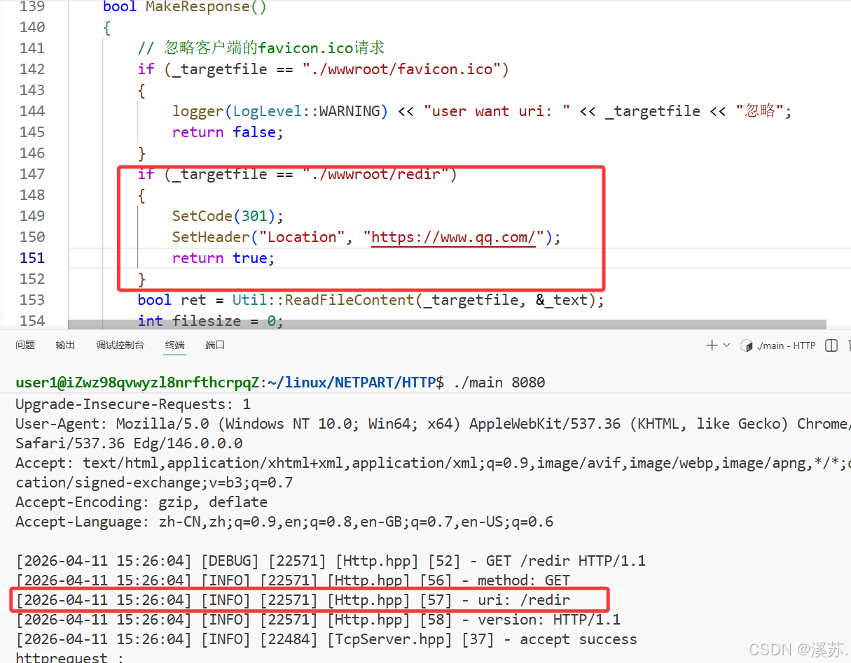 重定向到我们自己的资源:例如读取资源文件失败要返回404页面,当我们输入一个不存在的URI的时候,服务器不做读取404.html操作,而是设置状态码和报头分别为301和Location(value是我们服务器地址+端口+404.html的路径),浏览器接收到,重新发起请求,请求的是404页面,此次请求可以视为正常请求,因此走读取资源文件成功的逻辑,看代码: