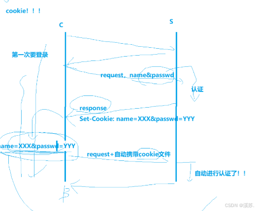 那么就需要引入cookie了,这也是HTTP报头中的一个字段,它的工作原理是这样的:用户第一次登录,服务器受理返回响应报文,此时报文报头中有一个Set-Cookie字段,这个字段记录了用户登录的状态信息,例如用户名、密码等,客户端浏览器会接收这个字段并且写入在文件或者内存中,下一次登录,用户不需要输入账号密码了,因为此时浏览器拿出了之前文件或者内存中保存的的cookie,那么请求报文中的cookie字段中包含之前登录的状态信息,服务器直接查询这个字段就知道是你了,完成登录。