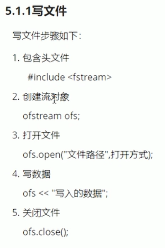 class Person { public: char Name[64]; int Age; }; void test() { ofstream ofs("person.txt", ios::out | ios::binary); if (!ofs.is_open()) { cout << "文件打开失败" << endl; return; } Person p = { "张三", 18 }; ofs.write((const char*)&p, sizeof(Person)); ofs.close(); }