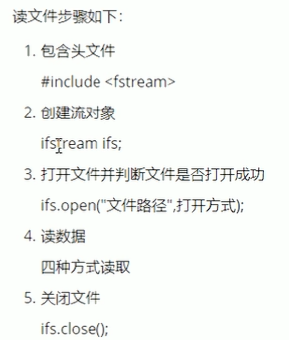 class Person { public: char Name[64]; int Age; }; void test() { ifstream ifs("person.txt", ios::out | ios::binary); if (!ifs.is_open()) { cout << "文件打开失败" << endl; return; } Person p; ifs.read((char*)&p, sizeof(Person)); cout << p.Age << endl; cout << p.Name << endl; ifs.close(); }这和上面写文件还有一个区别在于类p不能使用const,因为在p前面加入const会导致p中的数据无法修改,从而与read的功能相矛盾。
