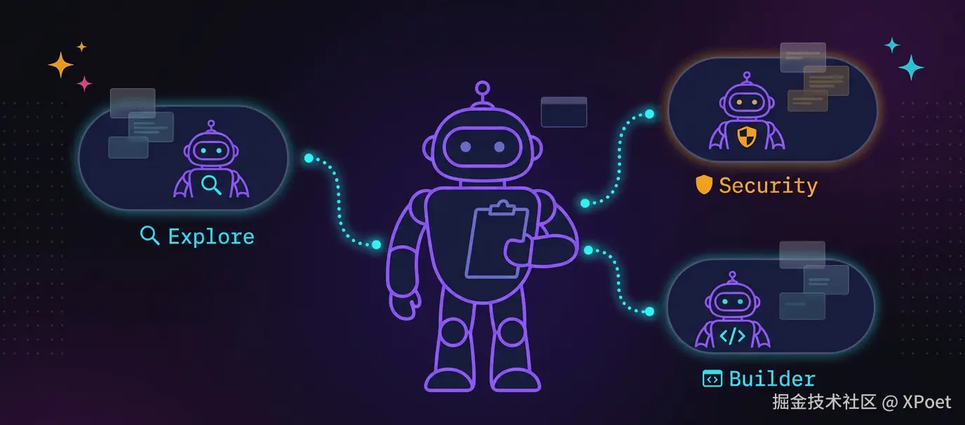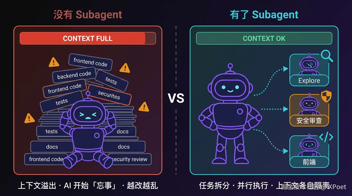 探索代码有探索员,安全审查有安全专家,前后端可以同步推进------每个 Subagent 专注自己的事,主 Agent 只管汇总结果。