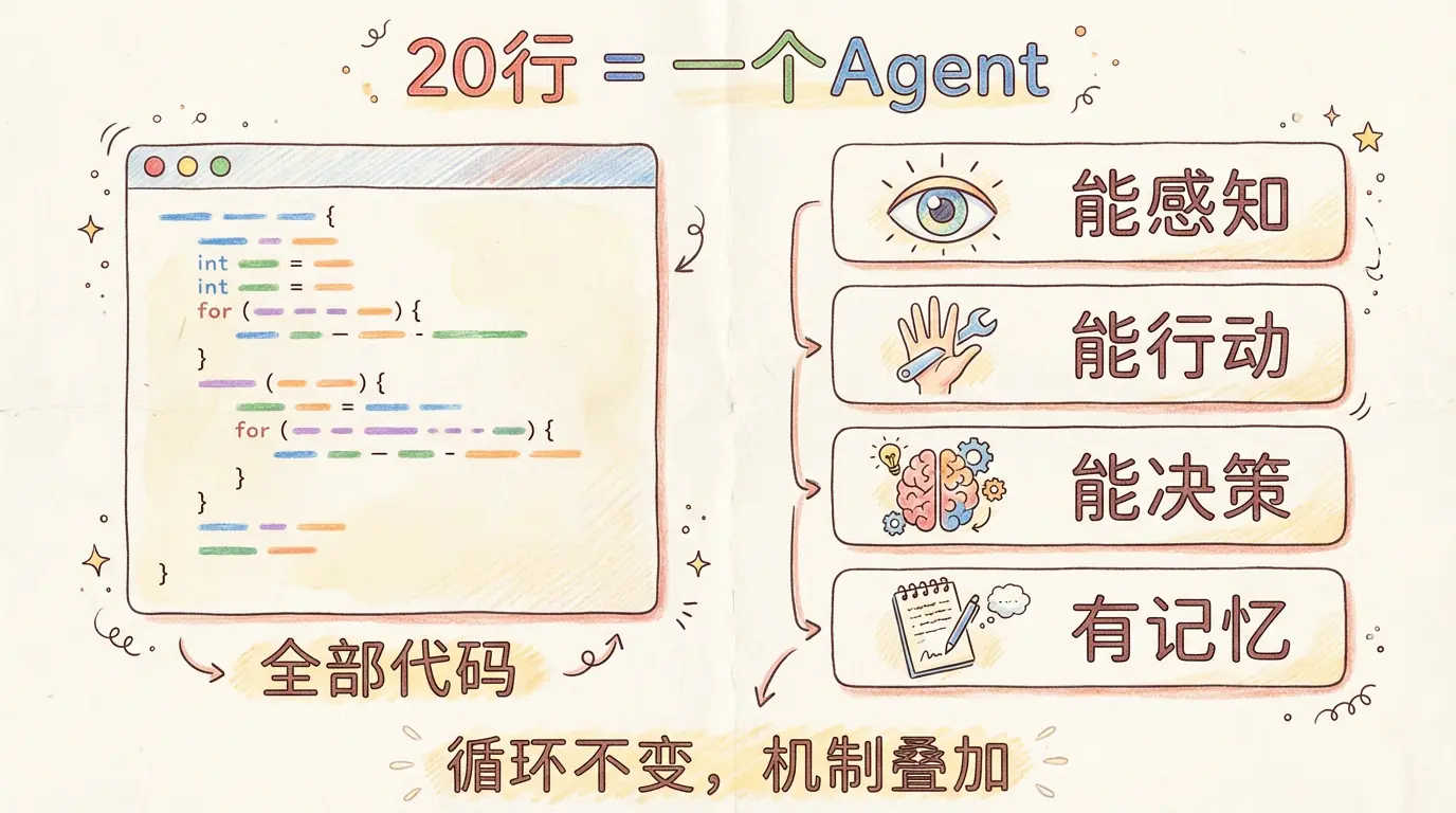 核心代码不到 20 行,但它已经是一个功能完整的 AI Agent: