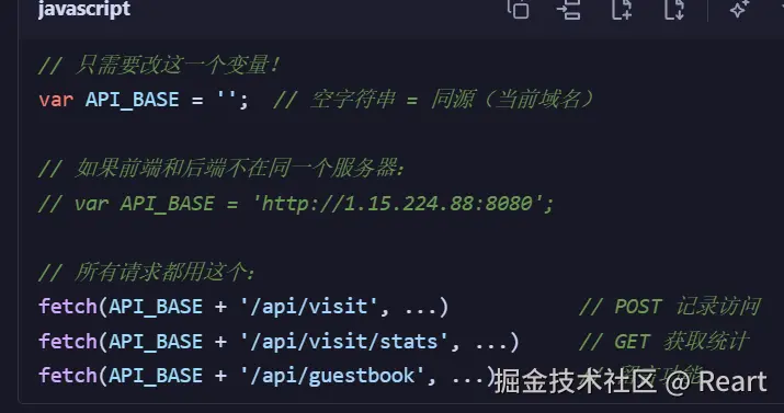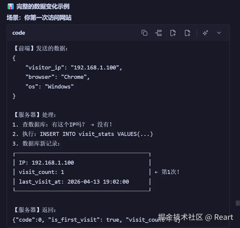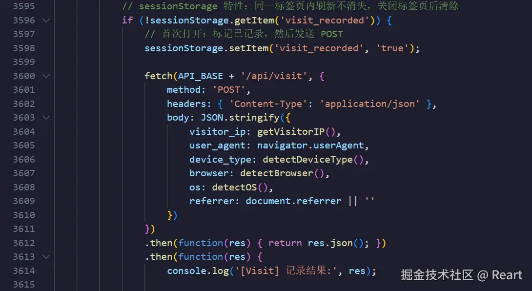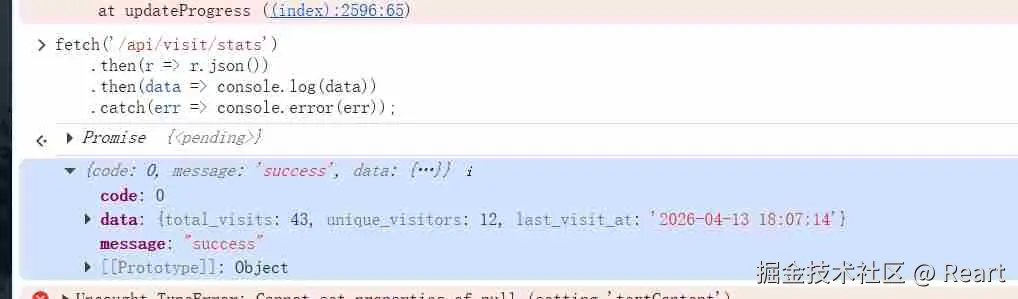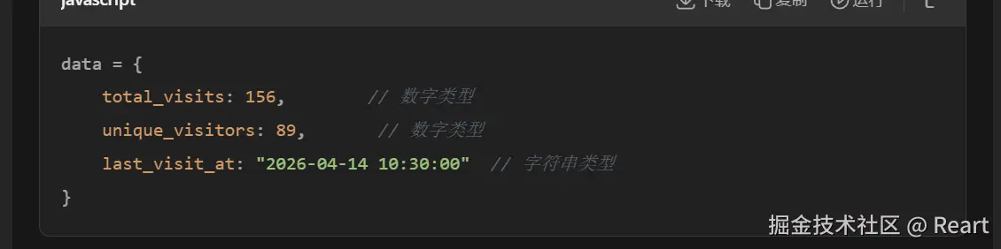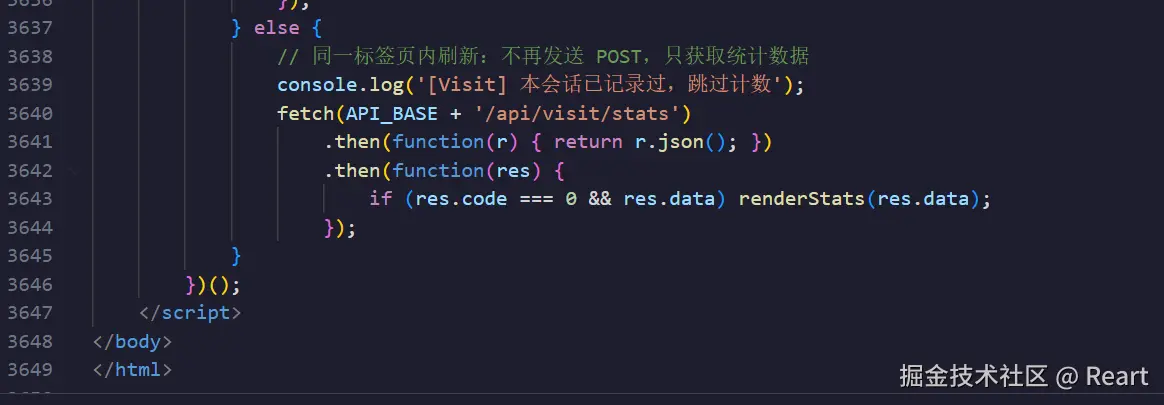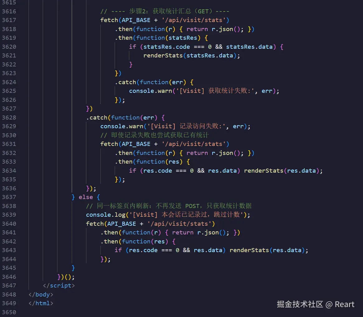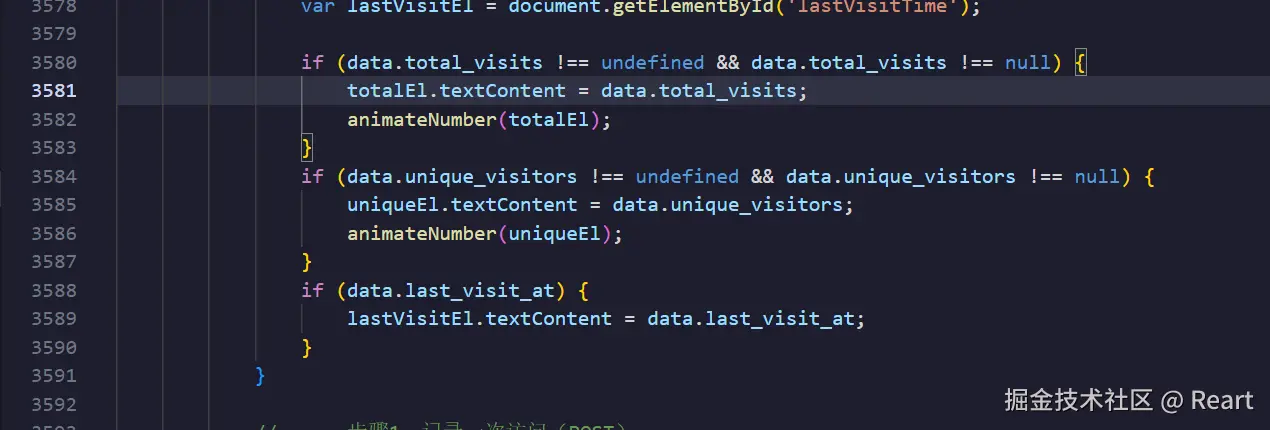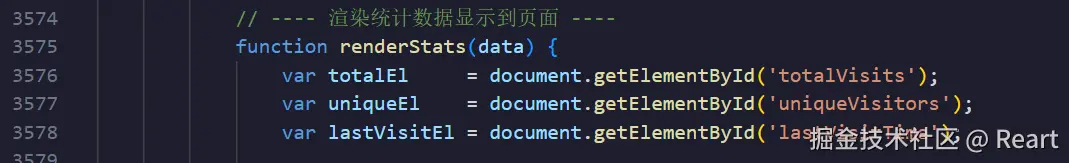 这里data.是指后端返回的json数据,这个数据需要先获取,在后续代码中会先用fetch函数获取再调用这个renderState函数,在判断了data..不等于undefined和null时将这个值赋给totalEL.textContent,之前说到totalEL可以理解成一个位置,这里就是赋给了这个位置里的数据了。然后再动画函数,三个if的格式都是差不多的就不再讲,注意最后一个if的判断条件可以理解为,读取了last_visits_at的值确定是对应时间的字符格式(2026/../.. 时/分/秒)才赋值。