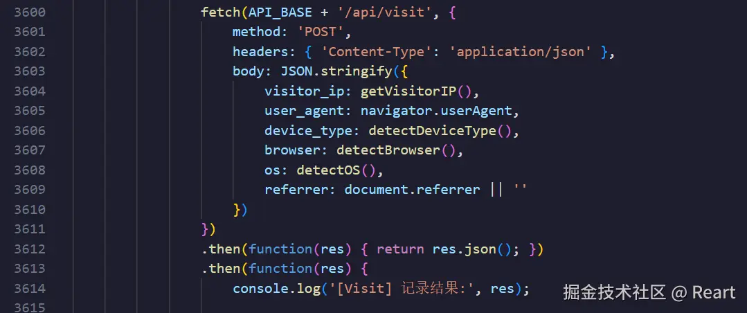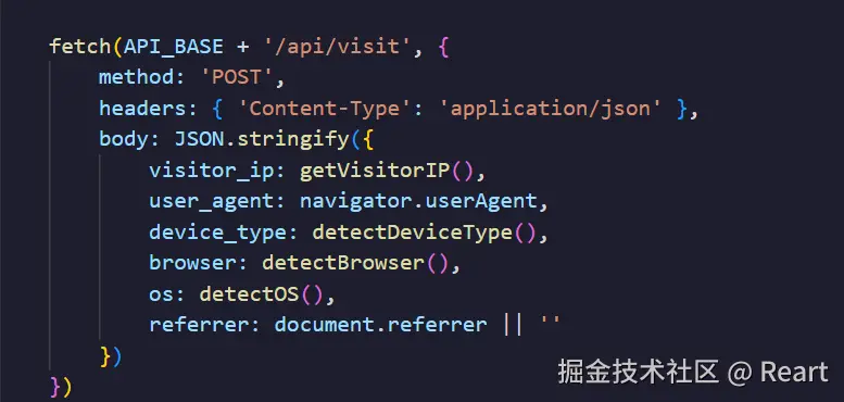 fetch的作用是向后端服务器发送http请求,把json化的用户数据 发送到后端服务器上,然后通过url路由匹配对应的函数处理数据,最后返回得到的数据。这个项目就是对应得到处理后的访客量,时间,以及人数等数据