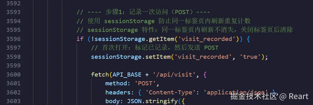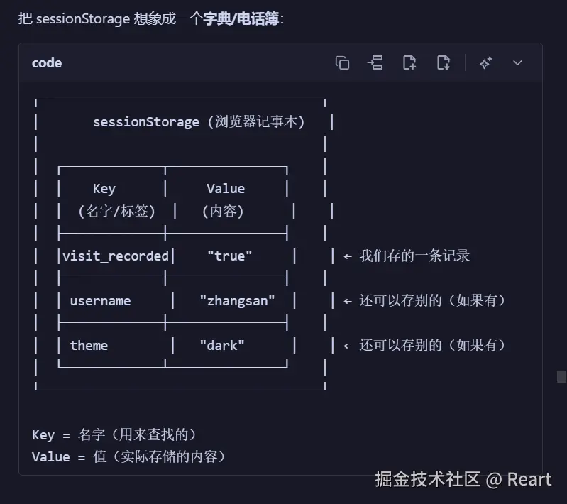 可以把这个当做一个当前标签页的一个内置小空间,里面存放了某些东西,这里的具体作用就是存放了一个标签(这个标签可以看成哈希表,它的下标是visit_recorded,值是true)如果在第一次访问这个网站打开标签页时,会定义visited_recorded并赋值true,于是你就可以通过调取visit_recorded的值来判断是不是同一个标签页(网站刷新前和刷新后是同一标签页,只有关闭网站再次打开才是另一个标签页),这就可以起到防止单纯刷新网站也会增加访问量数字的问题。