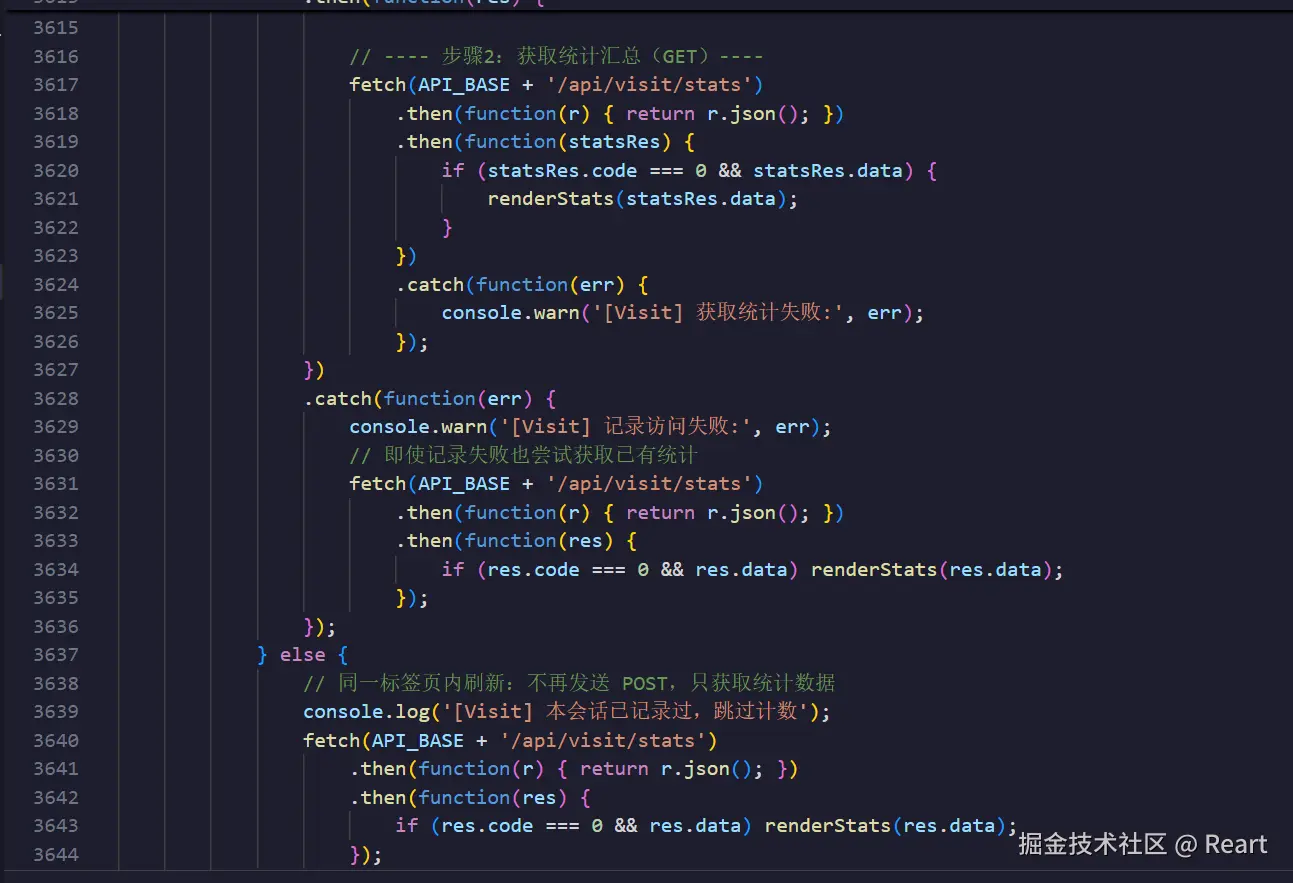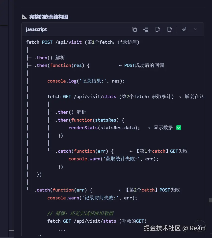 就是说在第一个fetch请求个人数据的框架下的then会继续fetch请求统计数据,请求统计数据的失败是第一个fetch,然后如果第二个fetch也就是说连第一次fetch个人访问都没成功的情况下,他就跳过个人访问,先把原本未更新的的统计数据返回
