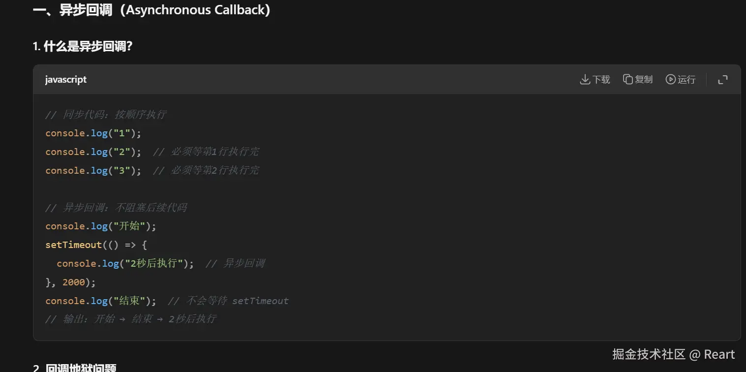 就是不阻塞后续代码的意思,比如我们这个第二个程序settimeout是需要一些时间才能执行console log,那么他会先打印'开始',再打印'结束',最后等'2秒后结束'可以打印了最后打印