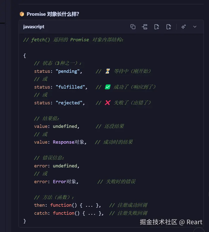 我们只看代码,fetch其实没有相应的 return语句,但其实他是有对应的内置返回值,可以想象成有一个隐藏的return 值,在后面.then异步回调中就会体现